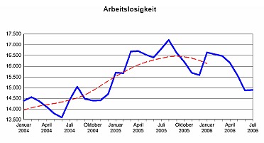 Kündigungstermin 30.6. belastet Arbeitsmarkt nur gering (Grafik:Arbeitsagentur)(jc) (aa) Im Juli 2006 hat sich die Zahl der Arbeitslosen in der Region Heidelberg nur unwesentlich erhöht. Der Leiter der Heidelberger Arbeitsagentur, Wolfgang Heckmann, zeigte sich von der Entwicklung angenehm überrascht. "Üblicherweise führen saisonale Einflüsse wie der Kündigungstermin 30.6. zu einem spürbaren Anstieg der Erwerbslosigkeit. In diesem Jahr war das nicht der Fall." Zwar mussten sich in den zurückliegenden vier Wochen 2.630 Männer und Frauen arbeitslos melden, im gleichen Zeitraum konnten aber fast genau so viele Personen (2.610) die Arbeitslosigkeit beenden. Verstärkt münden die Bewerber in Beschäftigung ein. Seit Jahresanfang nahmen immerhin 6.565 Arbeitslose eine Erwerbstätigkeit auf, 705 mehr als im entsprechenden Vorjahreszeitraum. "Die Dynamik des Arbeitsmarktes weist in die richtige Richtung, durch das verbesserte Dienstleistungsangebot der Agentur wird der positive Trend verstärkt." Ende Juli 2006 waren im Bezirk der Agentur für Arbeit Heidelberg 14.890 Männer und Frauen ohne Beschäftigung, 30 mehr als im Juni. Die Arbeitslosenquote, gemessen an allen Erwerbspersonen, blieb unverändert bei 6,9 Prozent. Im Vergleich zum Vorjahr gibt es jetzt 1.915 Arbeitslose weniger und die Quote verbesserte sich um 0,9 Prozentpunkte. Die Zahl der Arbeitslosen im Rechtskreis SGB III nahm gegenüber dem Vormonat um zehn auf nunmehr 5.910 ab. Zum Rechtskreis SGB II (Hartz IV) gehören 8.980 Arbeitslose, 40 mehr als im Juni. Der Anteil der zum Rechtskreis SGB II zählenden Arbeitslosen hat sich in den letzten Monaten merklich verschoben. Seit Januar stieg der Anteil der Hartz IV-Arbeitslosen von 52,2 Prozent auf jetzt 60,3 Prozent an. Im Juli suchten Betriebe und Behörden über die Arbeitsagentur Heidelberg 830 neue Mitarbeiter. Am Monatsende lagen 2.215 offene Stellen vor. Meist hatten die Vermittler bereits geeignete Bewerber vorgeschlagen, die Arbeitgeber hatten lediglich noch nicht abschließend entschieden, wen sie einstellen werden. Die Kurzarbeit nahm nach den aktuell vorliegenden Zahlen um 40 auf 250 ab.