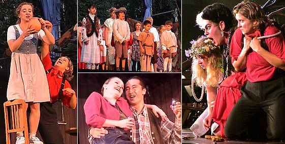 Hänsel und Gretel - märchenhafte Premiere bei den Schlossfestspielen Zwingenberg Jacqueline Krohne als Gretel und Dagmar Schneider als Hänsel (links), Kinderchor, Claudia Grundmann und Hong-Kyu Kim als Eltern (Mitte), Christian Voigt als Hexe (rechts). (Fotos:Richter)