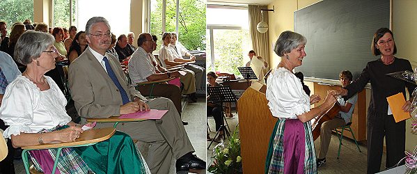 Ute Weber genießt nun die Freizeitphase der Altersteilzeit Links: Ute Weber mit Oberstudiendirektor Helmut Schultz, rechts: Ute Weber mit der Personalratsvorsitzenden Angelika Brinkmann. (Fotos: privat)(bro) (mst) Am vergangenen Freitag wurde die Schulsekretärin Ute Weber am Hohenstaufen-Gymnasium in einer sehr persönlichen Feierstunde in die Freizeitphase der Altersteilzeit verabschiedet. Die offizielle Verabschiedung in den Ruhestand wird erst im Jahr 2008 stattfinden. Was viele – Lehrer, Schüler und Eltern – lange Zeit nicht wahrhaben wollten, wurde nun zur Gewissheit: Der Lotse der HSG-Zentrale geht von Bord. Ute Weber hat in 20 Jahren mit drei Schulleitern: Friedbert Dörfler, Günter Wiedemer und zuletzt Helmut Schultz und einem sich ständig verändernden Kollegium in einer Weise zusammengearbeitet, dass sie die Hochachtung aller für ihre Arbeit in besonderer Weise erfahren hat. Mit gleichbleibender Freundlichkeit, mit nie nachlassender Geduld, mit größter Umsicht und einem nicht zu überbietenden Pflichtbewusstsein bewältigte sie nicht nur ein sich ständig veränderndes, sondern auch ein sich ständig vergrößerndes Aufgabenfeld in überaus kompetenter Weise, wobei sie ihr besonderes Talent in der Form unter Beweis stellte, dass sie viele ihrer Aufgaben meist gleichzeitig erledigte. Oberstudiendirektor Helmut Schultz betonte anerkennend in seiner Rede, dass es Ute Weber immer gelungen sei, in vielen Situationen allen den Rücken freizuhalten und freundlich und mit großer Umsicht für Ordnung in dem häufig recht turbulenten pädagogischen Wirbel zu sorgen. Ein mit Lehrern und Schülern besetztes Streicher-Ensemble umrahmte die Feier mit einem "Andante festivo", einem "Ceylon-Tango" und einem "Salsa für Ute". Die besondere Wertschätzung, die Ute Weber erfahren durfte, gipfelte in der Darbietung von "My way" von Jutta Gewahl (Fagott) und Eberhard Höhn (Klavier). Im Namen der Eltern bedankte sich Elternbeiratsvorsitzender Jürgen Scheuble für die überaus gute Zusammenarbeit, im Namen der Schüler dankten Charlotte Hamway und Murat Seker. Die Personalratsvorsitzende Angelika Brinkmann dankte Ute Weber im Namen des Kollegiums sehr herzlich und überreichte ihr einen Gutschein für eine Städtereise. Ute Weber, der die Schüler über all die Jahre besonders ans Herz gewachsen sind, verabschiedete sich mit einem Dank für die langjährige gute Zusammenarbeit und betonte, dass sie die Schule mit einem lachenden und einem weinenden Auge verlassen werde. Zum Abschluss lud sie ihre Gäste zu einem Sektempfang ein.