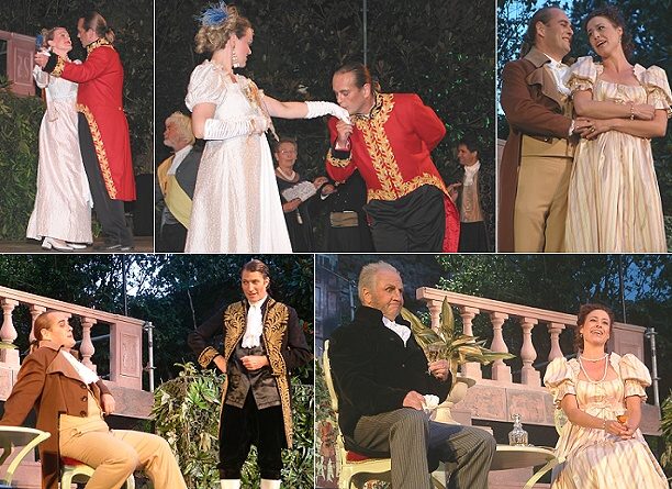 Walzerselige Atmosphäre im Zwingenberger Schlosshof Graf Zedlau mit seiner Gemahlin Gabriele (oben li. u. Mitte) und mit seiner Geliebten Franzi (oben re.). Kammerdiener Josef steht seinem Herrn bei seinen amourösen Verwirrungen zur Seite. Fürst Ypsheim-Gindelbach zu Besuch in der Sommerresidenz hält Franzi für die Gräfin Zedlau. (Fotos:SFZ/Wörner)(tw) (sfz) Operetten beruhen im Normalfall auf unmoralischem Inhalt. "Im Idealfall", so Renate Rochell, Regisseurin bei den Zwingenberger Schlossfestspielen, "sind sie sogar sehr unmoralisch. "Wiener Blut" zählt zur letzteren Kategorie." Weshalb die Regisseurin die "wienerischste Operette überhaupt", die gestern Abend im Zwingenberger Schlosshof Premiere feierte, schmunzelnd auch nicht unbedingt als "Familienoperette" empfiehlt.