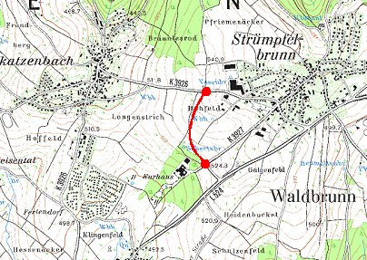 Kreisstraße zwischen Strümpfelbrunn und Waldkatzenbach wird verlegt 600 Meter Neubaustrecke (rot) sollen die Strümpfelbrunner Ortsdurchfahrt entlasten. (Grafik:NOK)(hr) (nok) Die Ortsdurchfahrt von Strümpfelbrunn ist seit Jahren geprägt von viel Verkehr. So führt beispielsweise die verkehrliche Anbindung der Firma Mosca mit rund 450 Beschäftigten über enge und kurvenreiche Straßen mitten durch die Ortschaft. Gefährliche Situationen und erheblichen Belästigungen waren und sind auch derzeit noch die Folge.