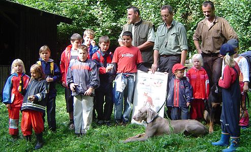 Alle haben die Kinderjägerprüfung bestanden Teilnehmer an der AWO-Aktion mit den Jägern Ingo Walter, Thomas Weber und Uwe Groß (v.l.). (Foto:privat)(hr) (awo) Die Jäger des Hegerings 5 und die AWO Eberbach hatten vorgestern im Rahmen des Kinder-Ferienprogramms zu einer Abenteuerwanderung mit Quizspielen eingeladen. Trotz Regenwetter nahmen rund 50 Kinder teil. Nach einem Jagdhornsignal wanderte man am Holderbach entlang zur Grillhütte am Teich. Die Jäger informierten über Bäume und Tiere des Waldes. Dann ging es zum Wildschweingehege. Hier wurde die "Kinderjägerprüfung" durchgeführt. Alle Kinder hatten sehr genau zugehört und konnten die Fragen richtig beantworten. Im Wildschweingehege konnten sie zwei Frischlinge beobachten. Sie waren erst zwei oder drei Tage alt.