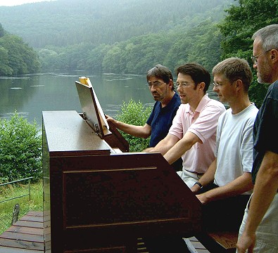 40 Finger auf drei Manualen - mit dem Shuttlebus zum Orgel-Event am Stausee Vier Künstler musizieren am Stauwehr: Hartmut Tramer, Achim Plagge, Godehard Weithoff und Ronald Autenrieth (v.l.). (Foto:privat)(hr) Eine außergewöhnliche Veranstaltung ist für Sonntag, 27. August, ab 19.30 Uhr angekündigt: Godehard Weithoff, Achim Plagge, Hartmut Tramer und Ronald Autenrieth gestalten ein Konzert an den Gestaden des Itter-Stausees zwischen Eberbach und Gaimühle.