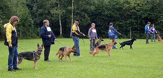 39 Hunden wurde die Eignung zur Zucht bescheinigt Hündinnen bei der Wesensprobe. (Foto: privat)(bro) (mb) Am letzten Freitag und Samstag fand die jährliche Körung der Ortsgruppe Eberbach auf dem Vereinsgelände an der Itter statt. Zur Beurteilung der Tiere war Körmeister Leonhard Schweikert aus Waghäusel geladen. Bei der Körung handelt es sich um eine Prüfung zur Zuchttauglichkeit. Voraussetzung zur Teilnahme an der Körung ist ein Alter von mindestens zwei Jahren, die Schutzhund 1-Prüfung, eine Ausdauerprüfung und eine Ausstellungsbewertung "gut" bei einem Richter des Schäferhundevereins. Zusätzlich müssen die Hunde noch das HD-Verfahren (Hüftgelenkdysplasie) und Hunde, die nach dem 1. Januar 2004 geboren wurden, auch das ED-Verfahren (Ell-bogendysplasie) durchlaufen haben und dies mit dem "a"-Stempel in der Ahnentafel belegen. So kann unter den Zuchttieren eine Auslese getroffen werden, die einen Hund nach Wesen, Leistung und Anatomie dazu befähigt, zur Erhaltung und Förderung der Rasse zu dienen. Zu Beginn werden die Hunde einer Wesensprobe unterzogen, hierbei müssen sie sich unbefangen, selbstsicher, nervenfest und gutartig zeigen. Bei der Schussprobe werden aus einer Schreckschusspistole mindestens zwei Schüsse abgegeben, hierbei hat sich der Hund gleichgültig zu verhalten. Im anschließenden Körschutzdienst wird das Triebverhalten, die Selbstsicherheit und Belastbarkeit bewertet. Danach werden die Hunde gewogen, vermessen und von allen Seiten im Stand und in der Bewegung begutachtet. Bei dieser Standmusterung erstellt der Körmeister den Körbericht, in welchem das äußere Erscheinungsbild des Hundes beschrieben wird. Des Weiteren werden Empfehlungen vermerkt, worauf bei der Auswahl eines Zuchtpartners geachtet werden soll. Nach diesem Körbericht wird vom Deutschen Schäferhunde Verein dann der Körschein erstellt. 41 Hunde wurden zur Körung vorgeführt, bis auf einen Rüden und eine Hündin konnte allen die Körfähigkeit und somit die Eignung zur Zucht bescheinigt werden.