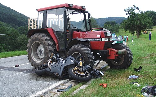Ein 64-Jähriger war mit seinem Traktor mit Anhänger von Heddesbach in Richtung Wald-Michelbach fahrend nach links in ein Wiesengrundstück abgebogen und hatte den entgegenkommenden Motorradfahrer übersehen. Bei dem Zusammenstoß wurde der Traktorfahrer leicht verletzt, das Motorrad und der Traktor stark beschädigt.