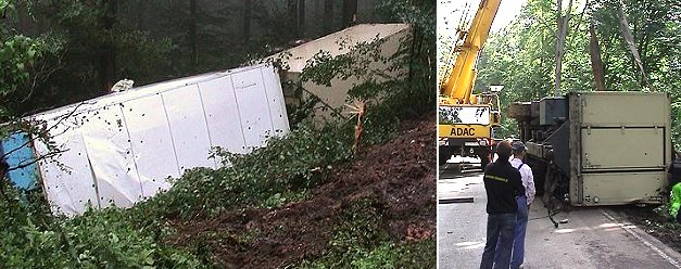 Lastzug stürzte in den Wald - hoher Schaden und schwierige Bergung (Fotos:Richter)(hr) An zwei starken Buchen endete heute Morgen gegen 8 Uhr die Fahrt eines Lastzuges aus Viernheim auf der L 590. Zwischen Eberbach und Schwanheim geriet der Fahrer nach rechts auf das talseitige Bankett, das vom Regen aufgeweicht war und sofort nachgab. Der Lkw stürzte samt Hänger in den Wald und überschlug sich. Die beiden stabilen Buchen etwa 15 Meter unter der Fahrbahn verhinderten ein weiteres Abstürzen des Gefährts.