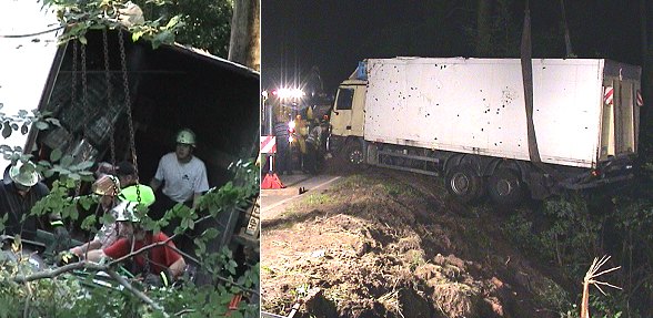Erst gegen Mitternacht konnte dann der Lastwagen zunächst auf die Räder gestellt und allmählich den Hang hinauf gehoben werden, was schließlich auch ohne Zwischenfälle gelang.