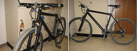 Das Mountain-Bike besitzt 24 Gänge, hat 26 Zoll-Stollenreifen, Federgabel vorne, T-Lenker, Alu-Rahmen und einen schwarzen Kunstledersattel. Das MB, Marke Marin wurde von Rot auf Schwarz umlackiert.