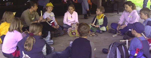 Musikalischer Ferienspaß am Waldklassenzimmer (Foto:privat)(cr) "Eine kleine Waldmusik" erklang am Dienstag, 15. August, im Gretengrund. Der Förderverein Waldklassenzimmer beteiligte sich am diesjährigen Eberbacher Ferienspaß und bastelte mit 13 Jungen und Mädchen Musikinstrumente aus Materialien, die sich die Kinder auf dem Weg von der Schranke im Gretengrund bis zur Hütte zusammen gesammelt hatten. Mit Unterstützung von Bettina Greif, Manuela Hoock und Ulrike Riedl, Mitglieder des Fördervereins, sowie durch kollektive Zusammenarbeit von kleineren und größeren Teilnehmern hielt am Ende der Aktion jeder eine Rassel und zwei Klangstäbe in der Hand, die vorort ausprobiert wurden. Dank der inzwischen anwesenden Eltern hatte man ein Publikum, das mit Applaus für die gelungenen rhythmisch-melodischen Beiträge nicht geizte.