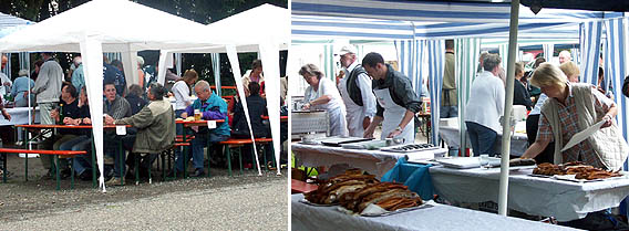 (tb) Zum traditionellen Seefest rund um den Katzenbuckelsee luden heute der Sportangelverein Katzenbuckelsee und die DLRG-Ortsgruppe Waldbrunn die Bevölkerung Waldbrunns und der näheren Umgebung ein. Da man im Vorfeld sich schon Gedanken wegen der zurzeit meist schlechten Witterungsverhältnisse gemacht hatte, hatte man erstmals das Zelt der Freiwilligen Feuerwehr von Strümpfelbrunn ausgeliehen, um den Besuchern einen trockenen Platz zu bieten. Ausgezahlt hatte dies sich allemal, denn zur Mittagszeit herrschte ein reges Treiben am Katzenbuckel. Trotz starker Bewölkung mit ein paar Regenschauern hatten sich wieder viele Besucher auf den Weg zum Katzenbuckel gemacht und füllten zusehends die Bankreihen. Mittags kam dann sogar die Sonne heraus. Reißenden Absatz bei dem Seefest, welches aus dem Waldbrunner Veranstaltungskalender nicht mehr wegzudenken ist, fanden die über Waldbrunns Grenzen hinaus bekannten guten fangfrischen Forellen, die gebacken oder geräuchert angeboten wurden. Rund 550 Stück hatten die Veranstalter in diesem Jahr wieder vorbreitet und innerhalb kurzer Zeit verkauft. Natürlich gab es auch andere Speisen, so dass jeder auf seine Kosten kam. Zum Nachtisch konnte man sich dann ein Stück Kuchen gönnen, während die Kinder sich in der aufgebauten Hüpfburg austoben konnten. Zusätzlich wurden noch Schlauchbootfahrten auf dem Katzenbuckelsee angeboten.