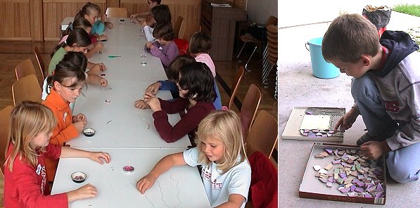 Bei der zweiten Ferienaktion kreierten 12 Mädchen und Jungen Mosaikspiegel. Auch hier waren die Kinder zwischen 8 und 12 Jahren mit guten Ideen am Werk. Zuerst mussten - oder durften - zahlreiche Fliesen mit dem Hammer auf die richtige Mosaikgröße zertrümmert werden. Die bereits vorbereiteten Rahmen mit einem Spiegelglas in der Mitte wurden von den jungen Künstlerinnen und Künstler unter der Anleitung von Ulrike Riedl und Angelika Wörner in farbenfrohe Unikate verwandelt.