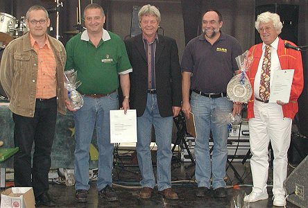 Langjährige Beschicker des Eberbacher Kuckucksmarktes geehrt Kulturamtsleiter Tobias Soldner, Richard Knopf, Bürgermeisterstellvertreter Günter Wiedemer, Heinz Thöne (DLRG) und Adolf Trost (v.l.) (Foto:Claussen)(jc) Im Rahmen der heutigen Eröffnung des Kuckucksmarktes wurden wieder langjährige Marktbeschicker geehrt. In diesem Jahr wurden für 25-jährige Teilnahme am Eberbacher Volksfest der Eberbacher Getränkehändler Richard Knopf, die DLRG Eberbach und die Firma Jürgen Blattner aus Aglasterhausen ausgezeichnet. Die Firma Adolf Trost ist mit ihrem "Glückscenter" bereits seit 40 Jahren ein fester Bestandteil des Kuckucksmarktes.