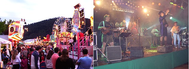 Bei Schauerwetter viel Betrieb und ausgelassene Stimmung im Festzelt (Fotos:Claussen)(jc) Trotz der wechselhaften Witterung kam am gestrigen Samstag der Eberbacher Kuckucksmarkt ordentlich auf Touren. Nach verhaltenem Besuch am Freitag herrschte gestern Andrang und gute Stimmung bei Besuchern und den meisten Marktbeschickern. Vor allem im großen Festzelt heizten "Die Mudbachtaler" kräftig ein und trieben die Gäste zur richtigen Volksfeststimmung. Bis in die letzte Reihe wurde auf den Bänken getanzt.