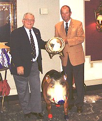 (jc) Die Eberbacher Delegation in Ephrata hat einen mitgebrachten Eber aus der Benefiz-Aktion "101 Eber für einen guten Zweck" den Vertretern des dortigen Gemeinderates übergeben. Die Präsentation fand gestern im "Ballroom at Doneckers" beim offiziellen Dinner der "Friends of Eberbach" statt. Bruno Schmitt las einen Brief von Bürgermeister Bernhard Martin vor, in dem die Hoffnung auf eine lang andauernde Partnerschaft zwischen den beiden Städten zum Ausdruck kam. Anschließend rekapitulierte Robert Moray als Vorsitzender der Freunde von Ephrata die Stationen der 30-jährigen Partnerschaft. Er würdigte auch die Arbeit des jetzigen Vorsitzenden Bob Bensing, der sich ebenfalls in einer kurzen Ansprache bedankte. Bill Hecker als ehemaliger Gemeinderatsvorsitzender von Ephrata dankte und würdigte die Arbeit der beiden Vereine. Die Gründungsmitglieder und die ehemaligen und aktuellen Stadträte aus Eberbach erhielten Plaketten als Dank für ihr Wirken. Gleichzeitig erwiderten die Freunde Eberbachs das Geschenk ihrerseits mit einer Weltkugel, die die Form einer Perle repräsentieren soll, da das 30-jährige Jubiläum das sogenannte Perlenjubiläum sei. Die Weltkugel soll ihren Platz im Eberbacher Rathaus finden. Im Anschluss wurde der Eber von den Stadt- und Altstadträten im Rathaus von Ephrata dem dortigen Gemeinderat mit den besten Wünschen übergeben.