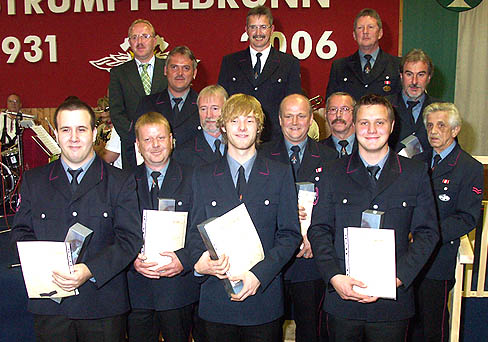 Feuerwehrnachwuchs zu Feuerwehrmännern ernannt Unser Foto zeigt die zu Feuerwehrmännern ernannten und die neuen Hauptfeuerwehrmännern beförderten Mitglieder der Freiwilligen Feuerwehr Strümpfelbrunn zusammen mit Bürgermeisterstellvertreter Heinz-Dieter Ihrig, Abteilungskommandant Harry Krieger und Gesamtkommandant Gerald Veith (obere Reihe von links). (Foto: Baumgartner)(tb) Beim Festbankett der Freiwilligen Feuerwehr Strümpfelbrunn am vergangenen Freitag (wir berichteten), konnten neben der Auszeichnung des Löschmeisters Peter Ihrig von der Abteilungswehr Mülben mit dem goldenen Feuerwehr-Ehrenzeichen für 40jährige ehrenamtliche Tätigkeit im Feuerwehrdienst auch zahlreiche Mitglieder der Strümpfelbrunner Wehr Ernennungsurkunden, bzw. Beförderungsurkunden entgegennehmen. So wurden die Feuerwehrangehörigen Patrick Bier, Anton Bredschneider und Manuel Steckler zum Feuerwehrmann ernannt. Die Oberfeuerwehrmänner Günter Beisel, Richard Ehleider, Günter Gepperth, Erich Haaf, Harald Haas, Christian Handl, Frank Dieter Schmitt, Gerhard Sigmund und Jürgen Westenberg wurden zu Hauptfeuerwehrmännern befördert. Die Beförderungen und Ernennungen wurden von Bürgermeisterstellvertreter Heinz-Dieter Ihrig vorgenommen. Gesamtkommandant Gerald Veith und der Strümpfelbrunner Abteilungskommandant Harry Krieger gehörten zu den ersten Gratulanten. Auch für die Abteilungswehr Strümpfelbrunn war dies eine große Freude, da mit den neuen "Feuerwehrmännern" auch der Nachwuchs innerhalb der Wehr gewürdigt wurde.