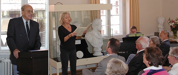 In 20 Jahren über 180.000 Besucher im ehemaligen Rathaus Monika Goebel und Peter Münch sorgten für den musikalischen Rahmen, Helmut Joho für den geschichtlichen. (Fotos:Claussen)(jc) Mit einem Festakt beging man gestern das 20-jährige Jubiläum des Museums der Stadt Eberbach. Bürgermeister Bernhard Martin lobte das Museum als Einrichtung, die Aufgrund der Verdienste des Museumsvereins weit über die Grenzen der Stadt hinausstrahle. Als Jubiläumsgeschenk versprach Martin, dass man sich seitens der Stadt darum zu kümmern, die Fassade des ehemaligen Rathaus, das am 21. Juni 1986 erstmals als Museum seine Pforte öffnete, wieder etwas ansehnlicher zu machen. Festredner Helmut Joho blickte in einer chronologischen Rückschau auf die Wurzeln des Eberbacher Museums zurück. Das Thalheimsche Haus wurde zwar 1938 als erstes Heimatmuseum eröffnet, zuvor hatten historische Funde, vom früheren Bürgermeister John Gustav Weiß zusammengehalten, wechselnde Lagerorte. 1954 wurde die Sammlung in den Speicher der Dr-Weiß-Schule und andere Räumlichkeiten ausgelagert. Von dort verschwanden im Laufe der Jahre zahlreiche Exponate, unter anderem die Fotos des ehemaligen Ehrenbürgers der Stadt, Adolf Hitler. Erst im Zuge der Vorbereitungen der 750-Jahrfeier der Stadt, wurde wieder Interesse an der geschichtlichen Vergangenheit wach. Der damalige Bürgermeister Host Schlesinger trieb die Bemühungen zur Gründung eines Museumsvereins voran, der mit Brigadegeneral a.D. Günther Schmelzer den ersten Vorsitzenden hatte.
