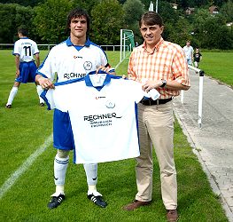 (jc) (pp) Zum wiederholten Male brachte die Firma Rechner Immobilien ihre Verbundenheit mit dem Fußballsport und insbesondere mit dem VfB Eberbach zum Ausdruck. Der Verein durfte zu Beginn der Spielzeit 2006/2007 einen neuen Trikotsatz für die I. Mannschaft in den klassischen VfB-Farben blau und weiß entgegennehmen.