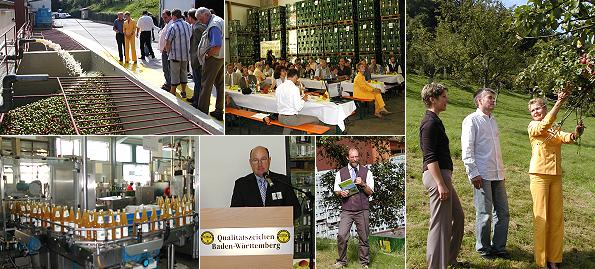 Fachveranstaltung der Fruchtsaftindustrie bei Falter in Heddesbach Links die Obstanlieferstrecke und Abfüllanlage, Klaus Heitlinger bei seinem Vortrag, Markus Zehnder bei der Buchpräsentation sowie Friedlinde Gurr-Hirsch (r.) mit Lothar Falter und Gitta Pätzold bei der Begutachtung der Baumbestände auf der an das Werksgelände angrenzenden Streuobstwiese. (Fotos: Claussen)