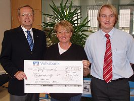 (jc) (vn) Grund zur Freude für die Vorsitzende der "DLFH-Aktion für krebskranke Kinder e.V., Heidelberg", Gabriele Geib: Ekkehard Saueressig, stellvertretende Vorstandsvorsitzender der Volksbank Neckartal eG , Marketingleiter Hugo Sablowski und Kundenberater Ralf Voigt überreichten ihr einen Spendenscheck über 5000 Euro aus den Zweckerträgen des Gewinnsparvereins Baden, dem die Bank angehört. Gabriele Geib dankte den Bankrepräsentanten für die Spende, die für die Anschaffung von Spiel- und Bastelmaterialien Verwendung finden. In ihren Dankesworten erinnerte die in Spechbach wohnhafte diplomierte Sozialpädagogin daran, das im kommenden Jahr die "Deutsche Leukämie-Forschungshilfe - Aktion für krebskranke Kinder e.V. Heidelberg" bereits ihr 25-jähriges Jubiläum feiern wird.