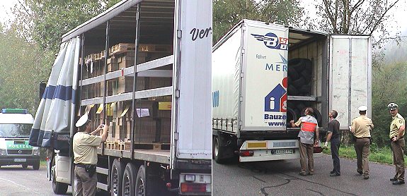 Polizei kontrollierte Brummis (Fotos:C.Richter)(cr) Landesweit kontrollierten Polizeibeamte am Dienstag Lastwagen auf den Straßen. Auch das Eberbacher Polizeirevier beteiligte sich daran. Mit sechs Beamten wurden von 8 bis 13 Uhr auf der B 45 zwischen Gammelsbach und Eberbach stichprobenartig 26 Lkw und ein Bus kontrolliert. Man habe die Strecke zwischen Gammelsbach und Eberbach deshalb gewählt, weil diese Kontrolle in Hessen nicht stattfand und man so in Eberbach die Fahrzeuge nicht zum zweiten Mal kontrolliere, die im Vorfeld aus Richtung Heidelberg oder Mosbach schon einmal angehalten wurden, so Polizeihauptkommisar Karl Link. "Die Kontrollen dienen dem Schutz der Fahrer und der anderen Verkehrsteilnehmer", betonte Link. Das Einhalten der Sozialvorschriften wie beispielsweise die Lenkzeiten des Fahrers, der Zustand des Fahrzeuges und die Ladungssicherheit waren Schwerpunkte bei dieser Kontrolle. Sechs Verstöße mussten die Beamte an diesem Vormittag beanstanden, die finanziellen Konsequenzen tragen meist der Fahrer und auch die Firma, der das Fahrzeug gehört.