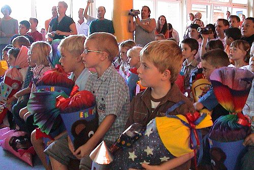 Eberbachs ABC-Schützen auf den Schulweg geschickt (Foto:C.Richter)(cr) Ein neuer Lebensabschnitt beginnt jetzt für über 150 Kinder in Eberbach. Am Montag dürfen die Mädchen und Jungen ihren zweiten Schultag in Angriff nehmen. Ihren ersten Schultag erlebten heute 70 Schülerinnen und Schüler in der Steige-Grundschule. Kinder aus den zweiten, dritten und vierten Klassen, also schon "alte Hasen", zeigten ihren neuen Mitschülerinnen und Mitschülern, dass es in der Schule ganz locker zugeht und man ganz einfach schreiben und rechnen lernen kann. Während der Zeit, in der die ABC-Schützen ihren ersten Unterricht verbrachten, warteten die Angehörigen bei strahlendem Wetter im Schulhof auf ihre Schützlinge. Die Elternvertreter der Steige-Grundschule sorgten mit einem reichhaltigen Kuchenbuffett, Kaffee und kühlen Getränken für Kurzweil.