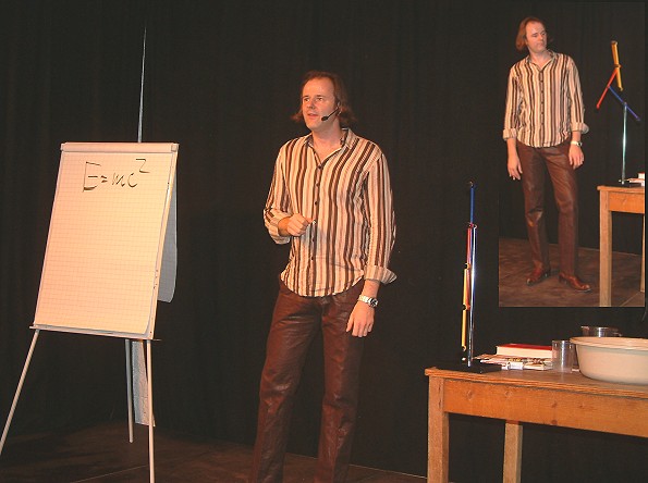 Wer später bremst fährt länger schnell- brillantes Wissenschaftskabarett "Je schneller das Licht desto früher wird’s dunkel": Vince Ebert erklärt die spezielle Relativitätstheorie anhand "einfacher Beispiele". Auch das Dreikörperproblem war mit Hilfe der chaotischen Bewegungen eines Pendels schnell verdeutlicht (kleines Bild). (Fotos:Wörner)(tw) Eine leidenschaftliche Lehrstunde in angewandter Physik gab es am Freitagabend in der Galerie Artgerecht. Das Kulturlabor hatte den Kabarettisten und diplomierten Physiker Vince Ebert nach über 2 Jahren wieder einmal eingeladen. Mit seinem Programm "Urknaller - Physik ist sexy" sei er voll im Trend, Physik sei Leben pur und tagesaktuell meinte Ebert. 2005 sei das Einsteinjahr gewesen und auch einige bekannte Zeitgenossen seien Physiker, wie Oskar Lafontaine und die Marie Curie aus der Uckermark, Angela Merkel. Die Kanzlerin habe schon bei ihrem Amtsantritt einen Quantensprung in der Arbeitsmarktpolitik versprochen. Nun sei aber doch ein Quantensprung die kleinstmögliche Zustandsänderung und zwar meist von einem hohen auf ein niedrigeres Niveau.