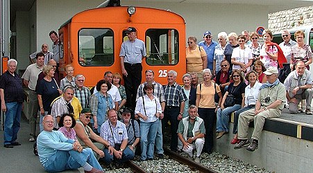 Am vierten Tag hieß es Abschied nehmen vom Hotel mit seinen Palmen und vom schimmernden See. Mit dem Bus ging es über den Lukemanierpass nach Disentis. Dort konnte der Aufenthalt zur Besichtigung des gewaltigen Klosters, zum Mittagessen oder zum Besuch des Bahnhofs genutzt werden. In Disentis wird der bekannte Glacier Express von der Rhätischen Bahn an die Matterhorn Gotthard Bahn (früher Furka Oberalb Bahn) übergeben. Es war ein reger Zugbetrieb zu beobachten. Nach dem obligatorischen Gruppenbild mit Schienentraktor ging die Fahrt weiter durch das Vorderrheintal und Lichtenstein zurück ins Neckartal. Ein herrlicher Ausflug hatte sein Ende gefunden.