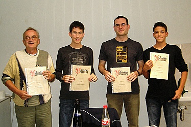 Team Florian Engelhorn / Timo Wäsch gewinnt Tandemturnier Das Siegerfoto: Attila Draxler und Felix Berger (2. Platz), Timo Wäsch und Florian Engelhorn (1. Platz) (v.l.). (Foto: privat) (bro) (tiw) Nach langem Warten ist es nun endlich soweit, der Schach Club Eberbach hat einen neuen Raum. Dieser befindet sich im ersten Stock des Nebengebäudes der Dr. Weiß Schule. Der Trainingsabend des Schach Clubs findet immer Freitags ab 18 Uhr für Jugendliche und ab 20 Uhr für Erwachsene statt, hierzu ist jeder eingeladen. Zur Einweihung des Clubraumes trug der SC Eberbach am vergangenen Freitag ein Tandemturnier aus. Beim Tandemschach spielen zwei Spieler gegen zwei Spieler, geschlagene Figuren können vom Mitspieler eingesetzt werden. Die Teams setzten sich aus je einem Spieler der ersten und einem der zweiten Mannschaft zusammen. Nach einem spannenden Turnierverlauf konnte sich das Team Florian Engelhorn/Timo Wäsch knapp mit sechs von acht möglichen Punkten durchsetzen. Die beiden nachfolgenden Teams waren beide mit fünf Punkten nur einen Zähler dahinter. Durch ein Entscheidungsspiel setzte sich das Duo Felix Berger/Attila Draxler vor Timo Höfler/Patrick Nitsch durch und erreichte damit den zweiten Platz. Den vierten Rang teilten sich die Mannschaften Florian Kappes/Jürgen Schumacher sowie Michael Engelhorn/Udo Lanz.