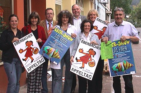 Die Apfeltag-Organisatoren: V.l. Susanne Reinig, Renate Lang-Wurm, Dieter Redder, Christina Wolff, Dietrich Müller, Birgit Valerius, Christine Lindenmuth und Rolf Wieprecht. (Foto:C.Richter)(tfs) (af/dt) Zum 20. Mal wird am Sonntag, 15. Oktober, in Eberbach der Apfeltag gefeiert. Für jeden Geschmack dürfte dieses Jahr wieder etwas dabei sein.