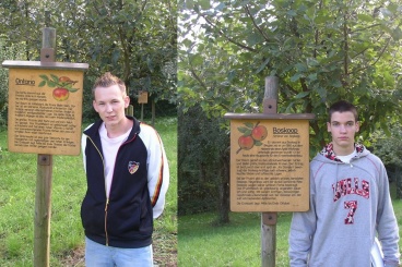 V.l.: Projektmitglieder Stefan Schüssler und Sven Bansbach an zwei von 20 verschiedenen Apfelbäumen in dem seit 2001 angelegten Apfelgarten in Binau. (Fotos:Schüssler/Bansbach)(tfs) (sb/ss) Wer denkt heute, bei den wenigen Einheitsfrüchten, die in den Regalen der Supermärkte angeboten werden, noch an die einstige Vielfalt von Apfelsorten in unserer Region? Da gerade die bodenständigen und traditionell im Odenwald angebauten Apfelsorten immer mehr in Vergessenheit geraten, haben zwei Teilnehmer der Projektgruppe "Der Apfel - stark für unsere Region" den "Binauer Apfelgarten" besucht und sich über die Geschichte des Apfelanbaus sowie über die verschiedenen Apfelsorten der Region informiert. Herr Großkopf, ein Bürger Binaus, führte die Schüler der Theodor-Frey-Schule durch den Garten.