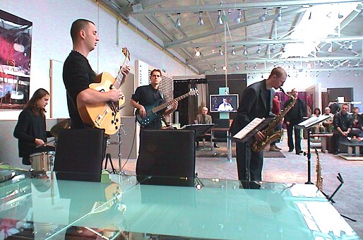Cowboys jazzten auf beachtlichem Niveau (Foto:Richter)(hr) (ra) Heute eröffnete Dr. Andreas Wiese, Geschäftsführer der Ronald Schmitt Tische GmbH, die Eberbacher Jazztage 2006. In der Ausstellungshalle spielten die "Jazz-Cowboys" gemeinsam mit Nicolai Pfisterer (Saxofon) zwischen Designermöbeln und lustwandelnden Gästen ihre Matinee.