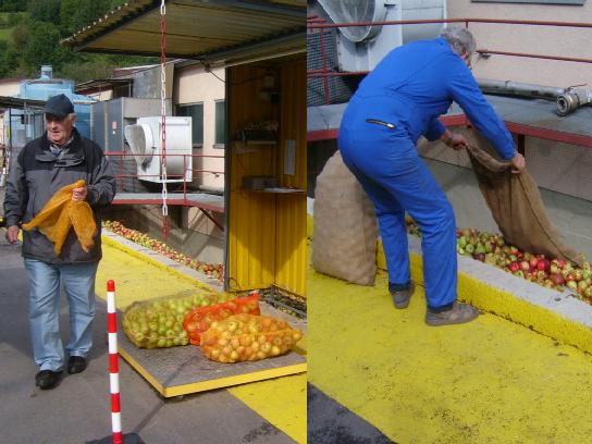 Streuobstwiesenbesitzer bei der Abgabe ihrer Äpfel bei Falter in Heddesbach. (Fotos:Varga)(tfs) (mv/ssa) Zwei Schüler der Theodor-Frey-Schule Eberbach haben sich im Rahmen des Projektes "Der Apfel - stark für unsere Region" die Frage gestellt, wie man die Äpfel aus der Region verwenden kann. Wer aus seiner Streuobstwiese mehr Äpfel erntet, als er selbst essen oder verarbeiten will, kann diese auch bei einer Apfelsammelstelle der Firma Falter Fruchtsaft GmbH abgeben und dort gegen Pfandmarken oder Geld eintauschen. Zehn solcher Sammelstellen gibt es in der näheren Umgebung, in Eberbach z.B. bei Hiltrud Rein auf dem Breitenstein. Dort, wie auch an allen Falter-Sammelstellen, werden die Äpfel gewogen und entsprechende Lohnmost-Gutscheine ausgestellt(50 kg Äpfel ergeben 30 l Saft plus Zuzahlung). Diese Gutscheine können gegen eine entsprechende Zuzahlung für alle Saftsorten der Firma Falter eingelöst werden. Selbstverständlich können die Äpfel auch zum entsprechenden Tagespreis von rund 8 Euro/100kg verkauft werden.