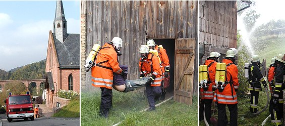 Jahreshauptübung in Friedrichsdorf wieder mit Unterstützung aus Kailbach (Fotos:Claussen)(jc) Traditionell unterstützt die Freiwillige Feuerwehr aus Kailbach die Kameraden aus Friedrichsdorf bei deren Jahreshauptübung. Auch heute waren unter den Augen von Stadtbrandmeister Jörg Kubein wieder 14 Mann und eine Frau aus dem Nachbarort mit ihren zwei Fahrzeugen den 23 ausgerückten Friedrichsdorfer Feuerwehrmännern zur Hilfe geeilt. Sieben Minute nach der Alarmierung waren die ersten Einsatzkräfte am Übungsobjekt in der Höhfeldstraße. Dort war ein landwirtschaftliches Gebäude in Brand geraten. Ein auf drei Personen beider Wehren verstärkter Angriffstrupp mit Atemschutz begann unverzüglich mit der Menschenrettung. In der Zwischenzeit wurde die Wasserversorgung über Hydrant und Fahrzeugtank hergestellt. Innerhalb von elf Minuten wurde zudem eine Versorgung aus Itter und Fahrbach zur Unterstützung aufgebaut, so dass mit einem massiven Löschangriff aus neun Rohren der Brand schnell gelöscht werden konnte. Abteilungskommandant Ralf Böhm und Jörg Kubein blieb am Ende nur positive Kritik am Ablauf. Ein verwechselter Schlauch und eine nicht ganz praxisgerechte Nachbetreuung der Geretteten fielen nicht weiter ins Gewicht bei der abermaligen Länder übergreifenden Kooperation der beiden Wehren.