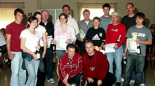 (tb) Heute hatte der TSV Strümpfelbrunn im Rahmen des Waldbrunner Kerwe-Wochenendes zu seinem Fußballturnier für Straßen- und Hobbymannschaften eingeladen. Insgesamt waren es wieder acht Mannschaften, darunter auch eine reine Damenmannschaft, die bei diesem Turnier teilnahmen, welches sich bei schönstem Herbstwetter auch in diesem Jahr einer guten Zuschauerresonanz erfreuen konnte. Bei der Siegerehrung heute Abend dankte der Vorsitzende Ralf Wieland allen teilnehmenden Mannschaften für ihren Einsatz. Das herrliche Herbstwetter habe für optimale äußere Bedingungen gesorgt. Spannende Spiele hatte man sehen können. Alle Spiele seien zudem fair und ohne Verletzungen verlaufen. Der erste Platz ging in diesem Jahr erstmals an die Stuhlmacher, die sich im Endspiel mit 3:1 Toren gegen Mülben durchsetzen konnten. Im Spiel um den dritten Platz gewannen Kicker von der Hahnenfeldstraße, die das Turnier im letzten Jahr für sich entscheiden konnten ebenfalls mit 3:1 Toren, aber im 9-Meter-Schießen, gegen die Mülbener Fichtensteller. Platz fünf ging dann an die Junge Union 1 vor dem Vorjahresfinalisten Steingasse. Die Plätze sieben und acht belegten die Siedlerstraße/Gartenstraße vor der Damenmannschaft der Jungen Union die bei der Siegerehrung einen Sonderapplaus. Als beste Torschützen wurden Thomas Frank und Alexander Blum ausgezeichnet, die jeweils achtmal ins Tor trafen. Abschließend dankte Wieland allen Helfern beim Turnier, insbesondere bei der Turnierleitung Achim Steiner (kniend links) und Marco Kohlbacher (kniend 2. v.l.) und den Schiedsrichtern Jürgen Herhoff, Matthias Steiner und Christian Steiner.
