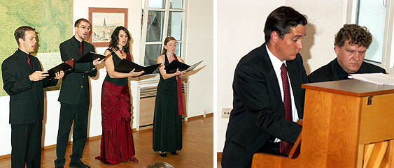 Stehende Ovationen zur Belohnung Zwei großartige Konzertabende gab es am Freitag und heute in Waldbrunn mit den einheimischen Gesangskünstlern Corina Schulz, Sonja Westermann und Jens Holzinger zusammen mit Bernhard Sommer (von rechts gesehen). Begleitet wurden die Künstler von den Pianisten Daniel Möllemann (links) und David Meyer. (Fotos:Baumgartner)(tb) Zwei fantastische Konzertabende gab es am Freitag und heute im großen Saal des Waldbrunner Rathauses, als die Waldbrunner Gesangssolisten Corina Schulz, Sonja Westermann, Jens Holzinger zusammen mit Bernhard Sommer und den Pianisten David Meyer und Daniel Möllemann zum dritten Konzertabend im Rahmen der Waldbrunner Kammerkonzerte einluden. Nachdem Jens Holzinger in lockerer Manier das Publikum begrüßte, bedankte er sich bei der Gemeinde für die Zurverfügungstellung des Saales. Gleichfalls bedankte er sich auch beim Kirchenchor Schollbrunn, der auch die Bewirtung in der Pause übernommen hatte, welcher Erlös für die Aktion „Kinder in Not“ gespendet wird.