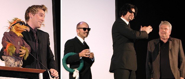 Die Zauderer begeisterten bei Infotainment-Abend der Volksbank Sascha Grammel mit "Frederik" sowie die beiden Mafiosi "Abdul" (l.) und "Luigi" mit "Eros" aus den Reihen des Publikums bei "Fesselspielchen". (Fotos:Claussen)(jc) Die Vizeweltmeister der Zauberei in der Kategorie Comedy Magic gastierten am gestrigen Abend auf Einladung der Volksbank Neckartal in der vollbesetzten Stadthalle. "Infotainment" ist die Überschrift der Veranstaltungsreihe unter der sich die Volksbank Neckartal ihren Kunden in großen Rahmen mit Informationen rund ums Geld, gepaart mit hochkarätiger Unterhaltung, präsentiert. „Die gröbsten Magier aller Zeiten“ wie sich "Die Zauderer" selbst bezeichnen, zeigten dabei feines Gespür für urkomische Situationen, wie man es sonst, selbst bei Vertretern dieses Faches, nur selten sieht. Gut aufbereitete Anlageinformationen, vorgestellt durch Achim Keusemann von der Union Investmentgesellschaft Frankfurt wurden von der grandiosen Show "The Magic of Money" des Trios erst richtig auf Touren gebracht. Ob als Mafia-Duo Abdul (Timothy Trust) und Luigi (Martin Sierp) oder als Bauchredner (Sascha Grammel) mit dem komisch selbstbewussten Vogel "Frederik", in fast jeder Situation wurde deutlich warum die Show bereits über 150 mal so erfolgreich über die Bühne ging.