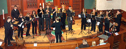 Pompöse Musik wie zum Beginn des Konzertes, als man die aus der Feder von Matthias Kiefer stammende "Sir Edwards Fanfare" präsentierte wechselte sich mit ruhigeren Stücken ab. Zwischendurch wurde es dann mit Stücken von Andreas Gremmelmaier an der Orgel, die man Königin der Instrumente bezeichnet, auch festlich. Dann gab es auch Stücke, bei dem die Gäste zum Mitsingen aufgefordert wurden. Hierzu hatte man dem Programm zwei Liedtexte beigefügt. Fremd anmutend unter den Stücken, die bis in das 15. Jahrhunderte musikalisch wurzelten, war insbesondere das Stück "Korn, das in der Erde". Es stammte ursprünglich aus dem Mittelalter und wurde in der dorischen Tonart, wie die musikalische Leiterin Uta Gimbel den Konzertbesucher erklärte, komponiert. Zur besonderen Stimmung und Wirkung bei diesem Stück trug auch die besondere Ausleuchtung der Kirche mit Kerzen bei.