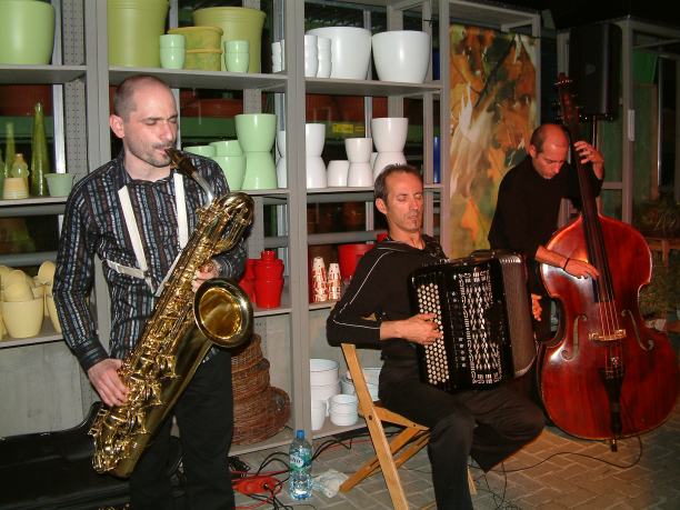 Jean-François Baëz Trio faszinierte mit Können und Hingabe Das französische Trio um den Akkordeonisten Jean-François Baëz mit Pascal Berne (Kontrabass) und Jean-Charles Richard (Bariton- und Sopransaxophon). (Foto:Wörner)(tw) Ein zahlreiches Publikum konnten Ralph Brenneis und Kulturamtsleiter Tobias Soldner am Mittwochabend in der Gärtnerei Brenneis zu einem weiteren JazzMe-Ereignis begrüßen. Soldner bedankte sich bei Familie Brenneis, die schon zum zweiten Mal eine Veranstaltung der JazzMe-Reihe in ihren Räumen mit diesem ganz besonderen Ambiente veranstaltete. Ein besonderer Dank Soldners ging an den Eberbacher Gastronom Charly Djivanidis, der alle JazzMe-Künstler, die wegen weiter Anfahrtswege in Eberbach übernachten, kostenlos beherbergt und an die Volksbank Neckartal,die JazzMe seit fünf Jahren maßgeblich unterstützt.