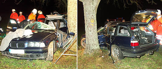 Überhöhte Geschwindigkeit als Unfallgrund (Fotos:Baumgartner)(tb) Überhöhte Geschwindigkeit war die Ursache für einen Unfall, der sich heute Abend kurz vor 18 Uhr auf der L589 kurz vor Weisbach ereignete. Ein aus dem Raum Ludwigsburg stammender BMW-Fahrer verlor aus Richtung Mülben kommend in einer lang gezogenen Linkskurve die Gewalt über sein Fahrzeug. Er versuchte zwar noch das Fahrzeug auf der Fahrbahn zu halten, geriet dabei kurz auf die Gegenfahrbahn, kam aber dann wieder auf der rechten Seite von der Fahrbahn ab und rutschte ca. 40 Meter auf einer Wiese, bevor er mit der Fahrerseite auf einen Baum prallte. Zur Bergung des Verletzten wurden die Feuerwehren aus Strümpfelbrunn und Weisbach und das DRK Waldbrunn alarmiert. Unter Zuhilfenahme schweren Bergungsgerätes wie Hydraulikschere und –Spreizer musste dabei das Dach des PKW abgetrennt und die Fahrertüre aufgebrochen werden.