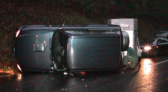 Geländewagen umgekippt - fast 30.000 Euro Schaden (Foto:Richter)(hr) Einen Unfall mit hohem Sachschaden löste ein 69-jähriger Autofahrer aus dem Odenwaldkreis heute am späten Nachmittag auf der L 524 zwischen Dielbach und Eberbach aus. Der Mann bog, ohne den Blinker zu setzen, in Fahrtrichtung Eberbach oberhalb der Edelmannswiese nach rechts in einen Waldweg ein. Eine nachfolgende Pkw-Fahrerin konnte ihren VW Golf noch rechtzeitig abbremsen, aber ein hinter ihr fahrender 46-Jähriger aus Buchen schaffte das nicht mehr. Er war mit einem Nissan Patrol und einem Viehanhänger unterwegs, stieß gegen das Heck des VW und gegen die bergseitige Straßenböschung. Der Zugwagen kippte um und blieb mit der Fahrerseite auf der Fahrbahn liegen. Verletzt wurde niemand. In dem Anhänger befanden sich zwei Kälber, die den Unfall auch unversehrt überstanden.
