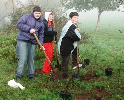 Es war an der Zeit, die über 2 m hohe Hecke auf den Stock zu setzen, damit sie wieder neu sprießen kann, wie Klemens Bernecker den aufmerksamen Jugendlichen erklärte. Besonders erfreut waren sie, neue Sträucher - Heckenröschen und Schlehen- zu pflanzen (unser Bild). Das schließt natürlich zukünftige Pflege ein, wie zum Beispiel Wässern bei trockenem Wetter, Absicheln des hohen Grases um die Pflanzlinge und Befreien von Brennnesseln und anderem Gestrüpp.