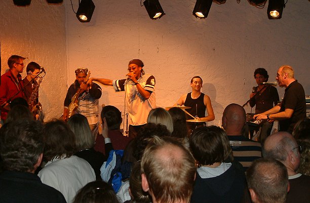 The Wright Thing gastierte in der Galerie Artgerecht Ian Fullwood (Saxophon), Daniel Stojonov (Gesang), Rick Washington (Gesang), Dany "Labana" Martinez (Gitarre u. Gesang), Chris Groß (Schlagzeug), Tamir Cohen (Gesang)und Jason Wright (Keyboard). (Foto:Wörner)(tw) Enttäuscht waren am Freitagabend einige Fans über das Fehlen unter anderem von Schlagzeuger Moritz Müller, Saxophonist Jimmy Gallagher aus Schottland oder Sängerin Rayla Sunshine. Bandleader Jason Wright hatte wieder einmal kurzfristig seine Besetzung geändert, und einige andere als die angekündigten Musiker aus dem mittlerweile mehr als 50 Musiker und Sänger umfassenden "Pool" seines Musik-Projektes mitgebracht. Dessen ungeachtet war ein Großteil der Zuhörer offenbar begeistert von der Formation, die am Freitag in der ausverkauften Galerie Artgerecht spielte. Sie feierten und tanzten zu Funk, Soul, Pop und Rockklassikern aus dem umfangreichen Repertoire von "The Wright Thing".