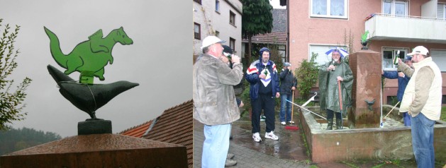 Traditionelle Brunnenputzete zur Kampagneneröffnung Gemeinsam schrubbten und wienerten die närrischen Kuckucke und Urmel unter fachkundiger Anleitung ihrer Präsidenten Dieter Müller und Joachim Schwab ihre "Patenkinder". (Fotos: Böhm)