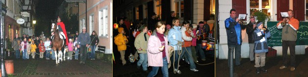 Textlich unterstützt durch ein "haushohes" Textblatt sangen die Kleinen und die Großen die bekannten Laternen- und Martinslieder. Begleitet wurden sie von einer kleinen Bläsergruppe, die in Kooperation zwischen der katholischen Pfarrkapelle und dem Eberbach Fanfarenzug entstanden war. Rainer Münch, Jochen Benkwitz und Alfred Huber hatten den Umzug auch schon in der Zwingerstraße und am Alten Markt mit Ihrer Musik begleitet.