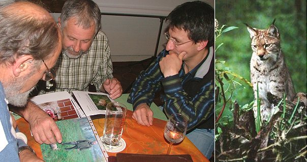 Streift die Raubkatze wieder durch den Odenwald? Wilhelm Blask (Mitte) zeigt Bilder von angefressenen Rehkadavern aus seinem Revier. Für die Luchs-Experten Gerhard Sauer (links) und Thomas Kaphegyi (rechts) deutet das aber eher auf Fuchsfraß als auf Risse durch den Luchs (rechtes Bild) hin. (Fotos:Richter/privat)(hr) Der Luchs ist wieder da - darin sind sich jedenfalls Jäger und Naturschützer im Odenwald einig. Zumindest ein Fragezeichen hinter die "Rückkehr des Luchses" setzt Thomas Kaphegyi, Wildbiologe und Luchs-Experte an der Uni Freiburg. Gestern Abend referierte er auf Einladung des Eberbacher Hegerings und der südhessischen Hegegemeinschaft Oberzent im Gasthaus "Kühler Krug" in Eberbach. Das Thema stieß auf großes Interesse: Rund 100 Zuhörer konnte Hegeringleiter Ingo Walter begrüßen.