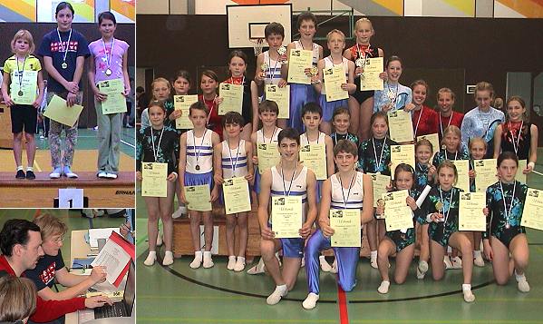TVE ermittelte seine besten Turnerinnen und Turner Links oben einige Erstplatzierte des Allgemeinturnens, links unten das EDV-Team bei der Auswertung, rechts die erfolgreichen Turnerinnen und Turner der Fördergruppen. (Fotos:C.Richter)(cr) Sportliche Leistungen und turnerische Vielfalt zeigten gestern rund 160 Mädchen und Jungen in Eberbach. Der Turnverein 1846 Eberbach hatte die aktiven Turnerinnen und Turner zu den Vereinsmeisterschaften 2006 in die Ittertalsporthalle eingeladen. In den Jahrgangsklassen 1993 bis 2000 traten die Kinder des Allgemeinturnens und der Fördergruppe an, um an den Geräten und am Boden ihre Leistungen mit ihren Turnkameraden zu messen. Zahlreiche ehrenamtliche Helfer des Turnvereins waren im Einsatz, um diese Veranstaltung reibungslos durchzuführen. "Hart, aber gerecht" seien die Wertungen für der einzelnen Turner erfolgt, betonten die Kampfrichter, die von 14 Uhr bis 18 Uhr in der Halle die Übungen begutachteten. Dank der elektronischen Datenverarbeitung konnten die Teilnehmer schnell ihre Ergebnisse erfahren. Alle Aktiven erhielten Urkunden, die Erstplatzierten Medaillen, einige sogar Pokale.