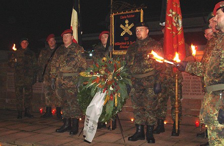 Volkstrauertag in Waldbrunn (Foto:privat)(hr) (kb) Wie schon in den vergangenen Jahren, setzte sich in Waldbrunn am vergangenen Sonntag im Rahmen der Feierlichkeiten zum Volkstrauertag bei Einbruch der Dunkelheit ein kleiner Gedenkzug, den die Reservistenkameradschaft Waldbrunn anführte, vom Rathaus zum Kriegerdenkmal, das zuvor von Ulla Sauer in mühevoller Arbeit festlich geschmückt worden war, in Bewegung.