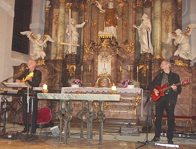 Die beiden Künstler aus Greifenburg bei Limburg, bekannt von vielen kirchlichen "Großevents" und zahlreichen CDs, brauchen keine grellleuchtenden Scheinwerfer auf der Bühne, sondern sie begeistern die Menschen ganz einfach mit ihren religiösen und tiefsinnigen Liedern. Das technische und musikalische Equipment der beiden Musiker besteht aus einer kleinen Verstärkeranlage, einem Keyboard, E-Bass, Rhythmus- und E-Gitarre. Damit zauberten sie eine begleitende Atmosphäre zu ihrem Gesang und den gesprochenen Texten und erzeugten bei vielen Zuhörern eine "angenehme Gänsehaut".