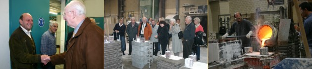 zu seinem gelungenen Kunstwerk gratuliert.Die Gruppe betrachtet in der Gießerei, wie aus dem Modell im Sandguss anspruchsvolle Bronzeskulpturen entstehen. Der Gießer zeigt, wie er mit ausgeprägtem Zeit- und