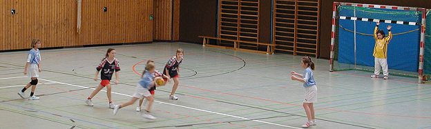 Auswärtssieg in Handschuhsheim für neu formiertes Team Die SGH im Angriff. (Foto:Claussen)(jc) Nach ersten Lehrstunden in Sachen Handball, wissen jetzt auch die Kleinsten im regelmäßigen SGH-Spielbetrieb, wie sich ein Sieg "anfühlt". Die zu Saisonbeginn neu formierte weibliche E-Jugend siegte im Auswärtsspiel in Handschuhsheim mit 6:11 (5:6). Nach den Handballregeln dieser Altersklasse im Handballkreis Heidelberg wird das gewertete Endergebnis aus dem Produkt der erzielten Tore und der Anzahl der jeweiligen Torschützen ermittelt. Bei zwei Torschützen auf Handschuhsheimer Seite und deren drei auf SGH-Seite wird das Endergebnis mit 12:33 für die SGH Waldbrunn/Eberbach gewertet.